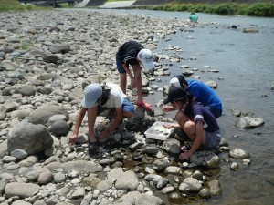 最初に川の石を裏返して、どんな生き物がいるのか調べます。