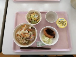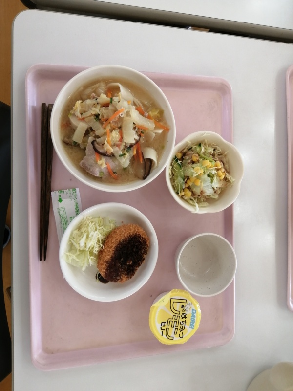 だんご汁、コロッケ、サラダ、ゼリーです。