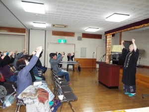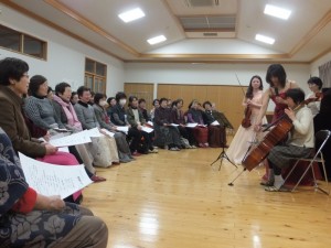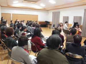 東日本大震災で被災された方たちへの応援歌「花は咲く」、「見上げてごらん夜の星を」など、演奏にあわせて、聴講者で合唱しました。