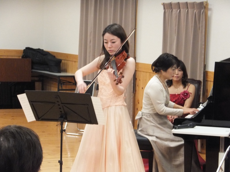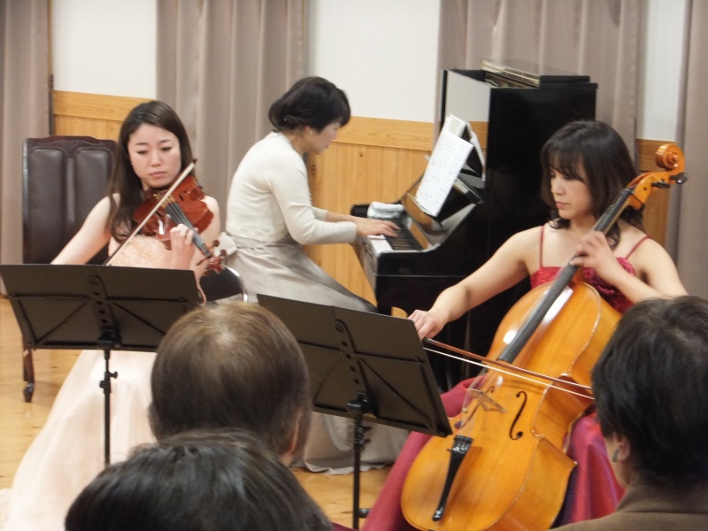 演奏者は「アンサンブルウエリナ」。バイオリン、チェロ、ピアノのアンサンブルで、エルガー作「愛のあいさつ」、ベートーベン作「ピアノ三重奏曲第4番「街の歌」、モンティ作「チャルダッシュ」など、お馴染みの曲を演奏しました。