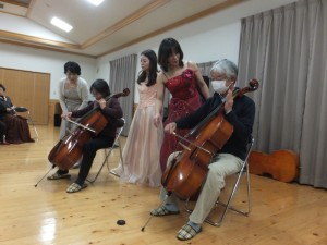 途中、聴講者にチェロ演奏体験をさせていただき、聴講者のチェロ演奏に、バイオリンとピアノの演奏を載せて、みごとな
