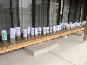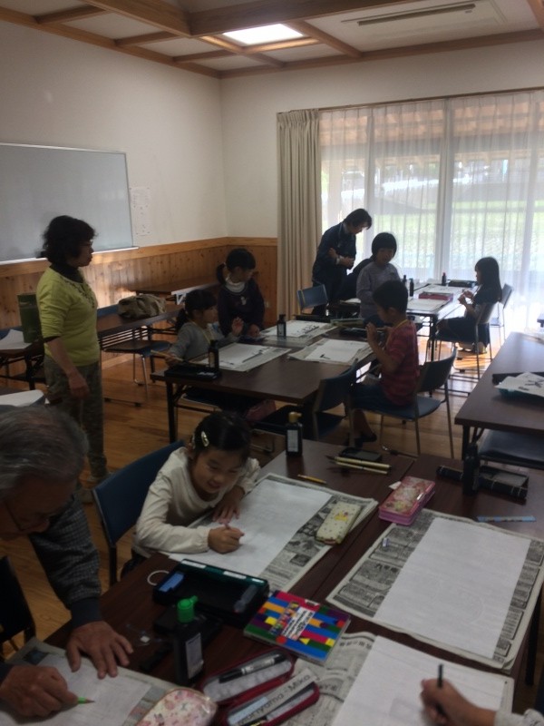 習字教室のみんなは毛筆で想いを書いて、絵も描き加えて竹灯ろうをつくりました。