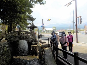 大原神社まで歩き、水路にオシドリがいないかみんなで