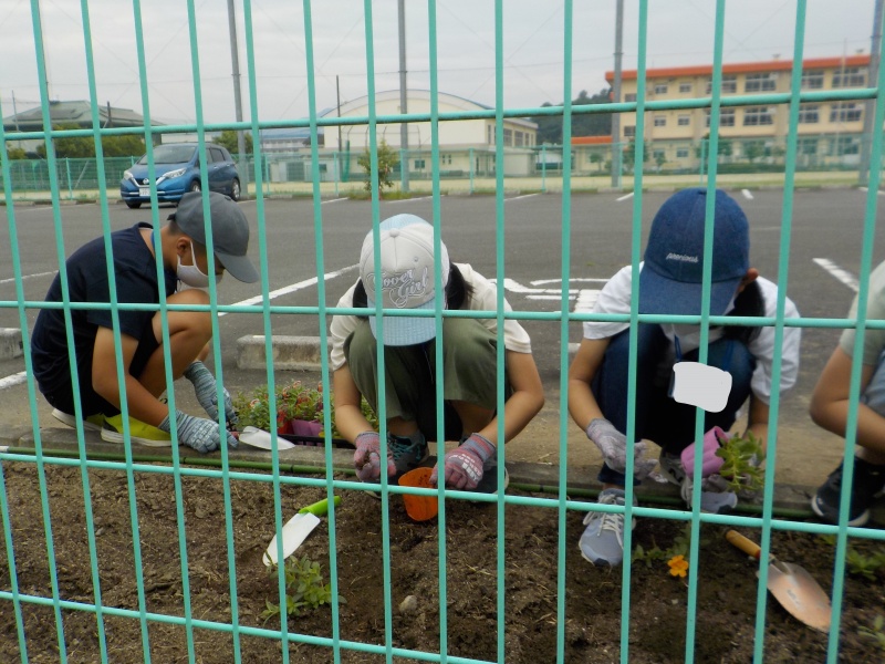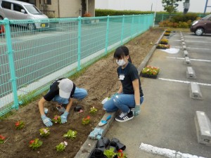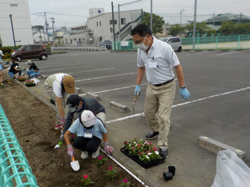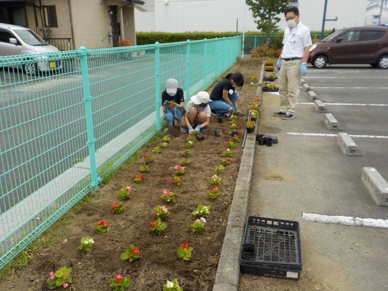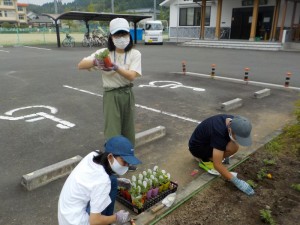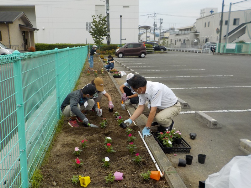 開講式の後は、3班に分かれて駐車場の花壇の花植えを行いました。