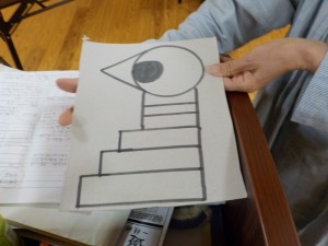 みんなに言葉で伝え、白紙に同じ絵を描くように指示を出します。