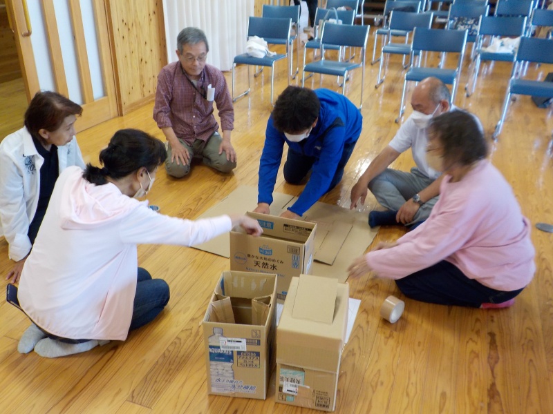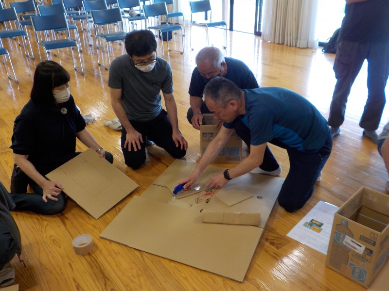 簡易トイレは段ボールを2つ使い、緊急時に座って使用できるように