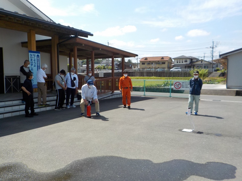 消火訓練は駐車場で水消火器を使用して、火の種に向かって水をあてる