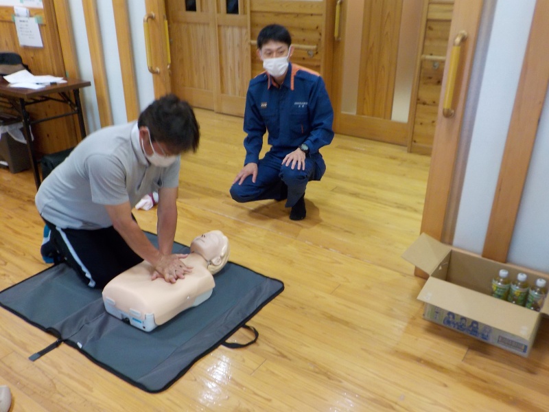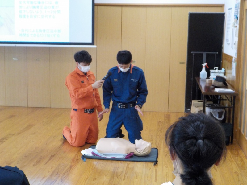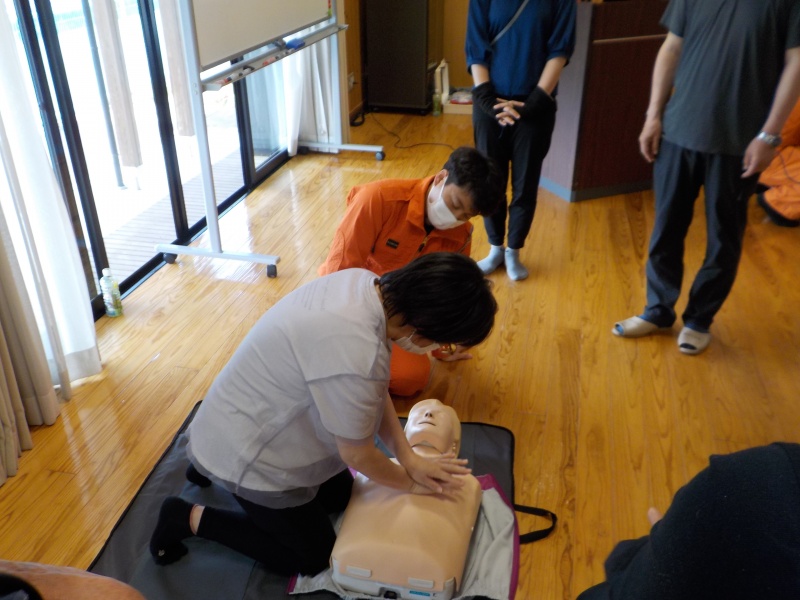 後半は救急救命士の方の指導の下、救急救命講習を行いました。