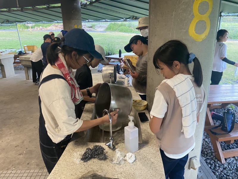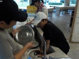 食べ終わった後は、みんなで食器や鍋を洗います。火が強く鍋が
