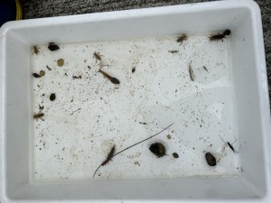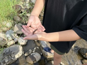 石の裏などにヤゴなどが、水の中に小魚が多くいて、小エビなども見つけました。
