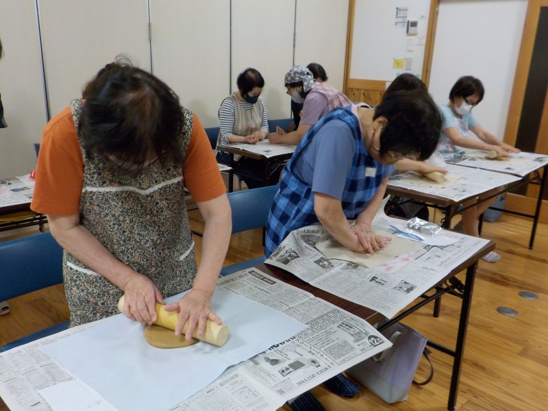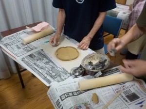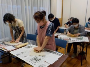 お皿を作る方は、シートを使わず、布の上に粘土を置き、麺棒で