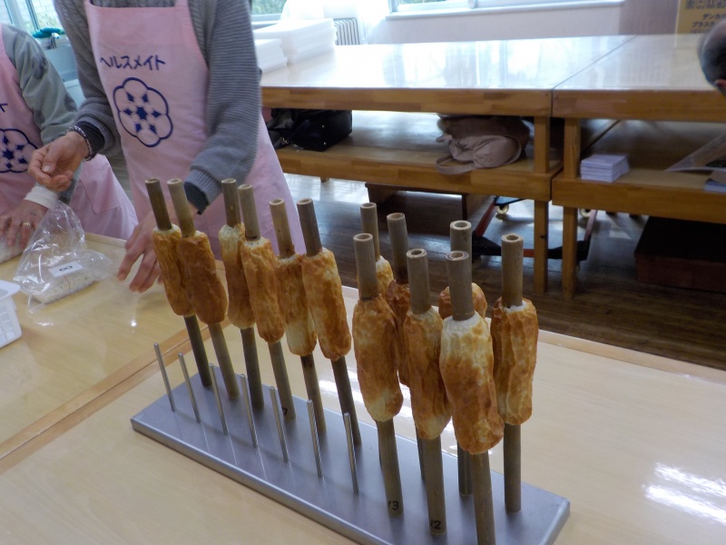 丸い竹の棒に薄く引いたすり身を包丁を使って巻きつけて