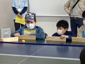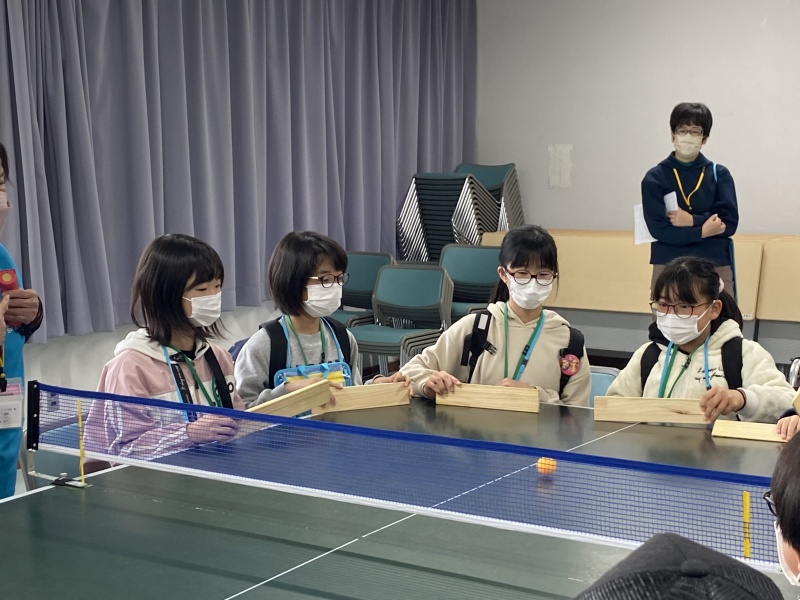 はじめは参加者全員で卓球バレーを行いました。競技の内容は卓球のピンポン玉と