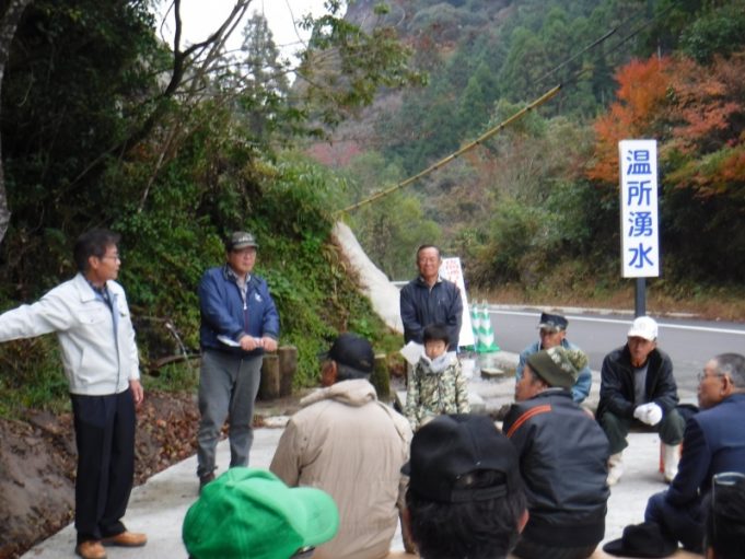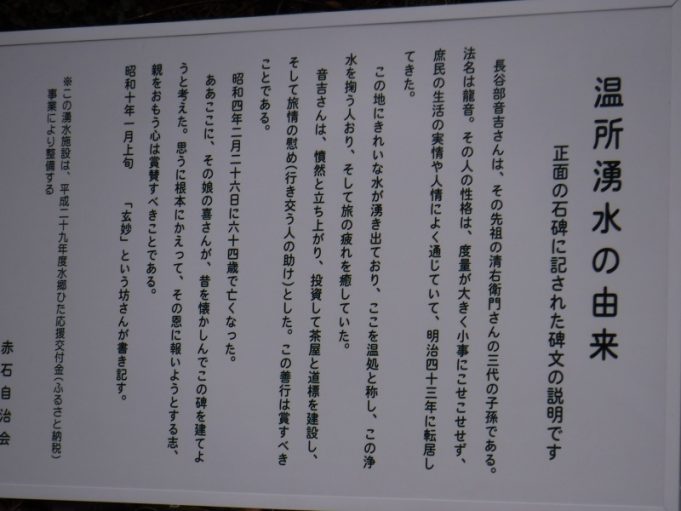 そこで、「赤石のいいところを発信しよう!」という、昨年度有志で立ち上がったグループ「天空の里・ゆかいくらぶ」が、赤石自治会に働きかけ、赤石自治会で「温所湧水」の看板を完成させました。