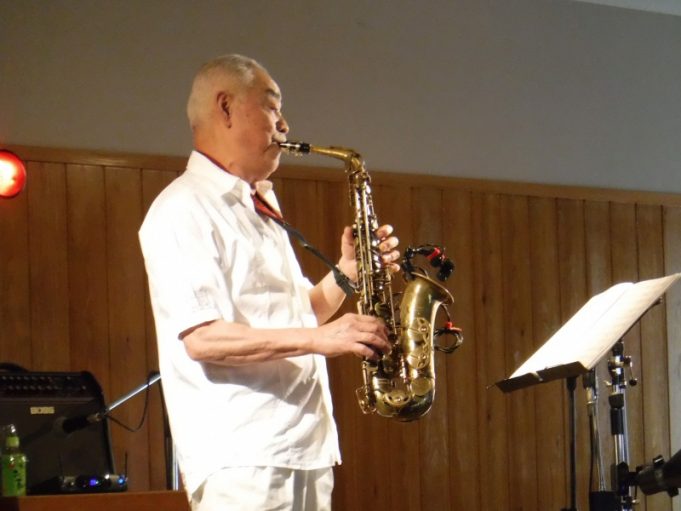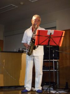 また「北国の春」「上を向いて歩こう」、美空ひばりの「港町十三番地」「愛燦燦」「川の流れのように」ほか10曲をサックスの演奏により受講生で合唱しました。