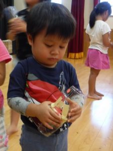 2つのプラスチックコップの間に挟んだ厚紙にはどんぐりが通るくらいの穴が3つ空いていて「マラカス」みたいに上下にふるとどんぐりが「カラカラ」と音をたてます。