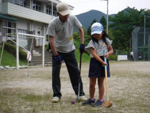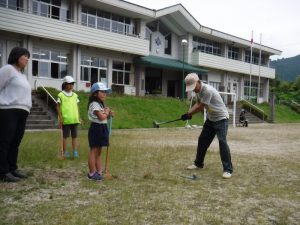 6月22日、前津江小学校グラウンドで、小学生と地域の高齢者との交流グラウンドゴルフが開催されました。