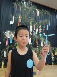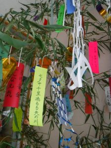 七夕飾りを作りました。前津江公民館の玄関に飾っています。