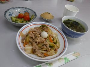 夏野菜をたっぷりと使った中華丼や、きゅうりとトマトの和え物、汁物、デザートをつくりました。