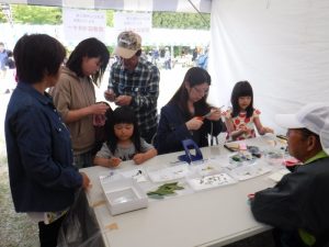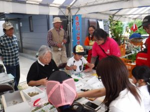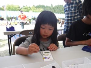 前津江の特産物である「わさび」の花を使った「しおり作り体験コーナー」を担当しました。