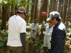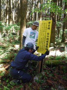 山中を登ること30分、殿様屋敷跡に到着。地権者に許可をいただき、以前の杭が立っていた場所に新しい看板を設置しました。