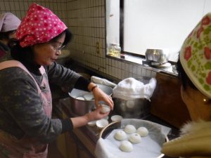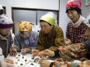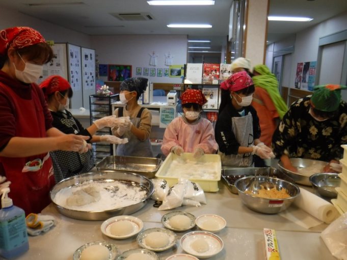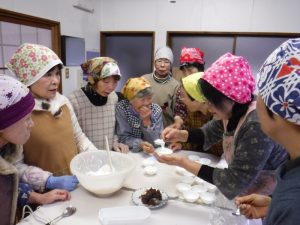 12月14日、前津江町赤石の虫秋公民館にて「かるかん饅頭」作りを行い9名が参加しました。