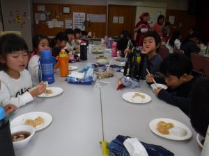 お昼は持参したおにぎりと、みんなで作った具沢山味噌汁です。