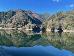 普段何気なく通り過ぎる松原ダムですが、湖面からみる秋の風景はとてもキレイで趣があります。