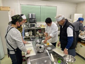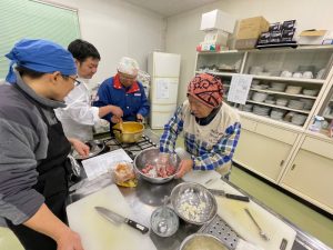 今回、70代の高齢の方から30代の若者まで、幅広い世代の方が参加。料理なんかしたことない!という高齢者の方を、台所に立つことがあるという今どきの若者がうまくリードしてくれ、思った以上にスムーズに料理が完成しました。