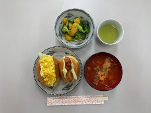 この日の献立は、かぼちゃ卵サンド、みかんとブロッコリーのサラダ、ミネストローネの3品。
