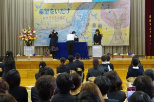 式は厳かに、子ども達は規律正しく、素晴らしい式でした。特に、在校生からの「お祝いのことば」、卒業生の「お別れのことば」は感動的で涙を誘いました。「卒業生の皆さん!保護者の皆さん!誠におめでとうございます!」