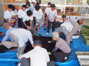 7月9日、戸山中学校に老人クラブのメンバーが集まってきます。 財津町、藤山町、秋原町、市ノ瀬町、伏木町から20名の方々が集まってくれました。 この日は早朝から戸山中学校の1年生とサルビアの苗を植えます。 老人クラブの方々と1年生が交流をしながら作業を進めていきましたが、こういった活動が地域づくりの基本になると感じました。