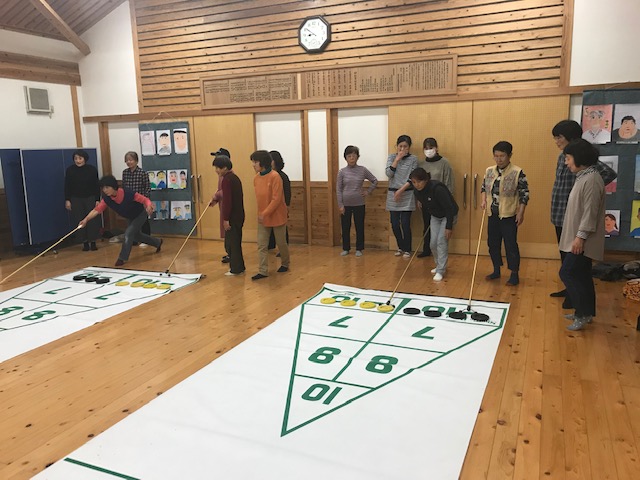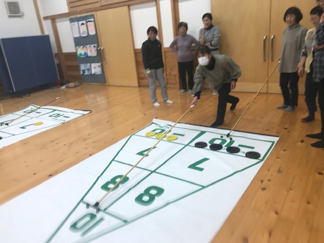 11月29日(金)藤山公民館で成人学級を行いました。 この日はシャッフルボード。 初めて行うものでしたが、皆さん興味津々。 徐々にコツをつかみ、笑い声にあふれていました。 頭と体の体操になりましたね。