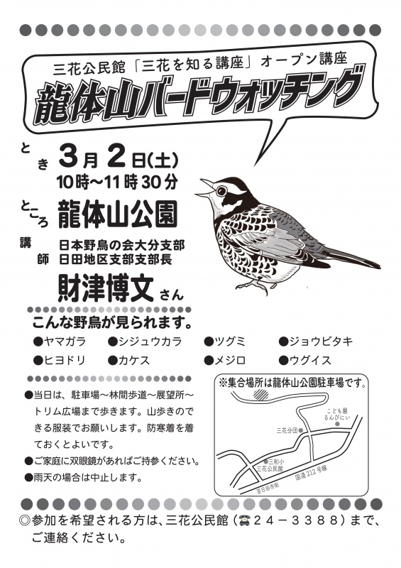 来る、3月2日。龍体山バードウォッチングが開催されます!