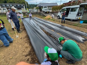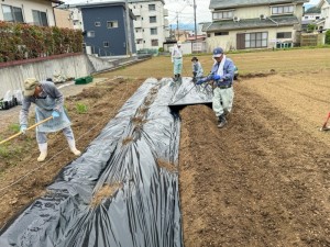 片方で抑える子、マルチの端をもって引っ張る子に分かれて張っていきます。