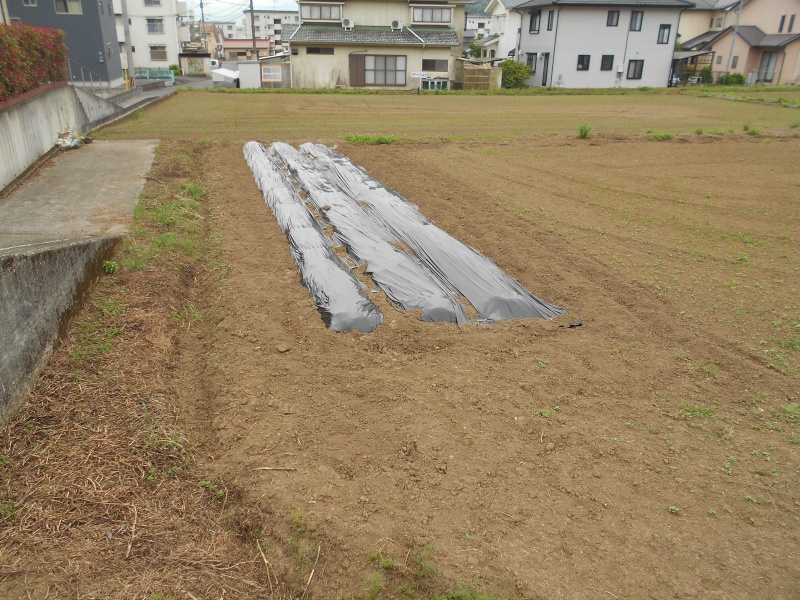 最後に、黒マルチと苗の間にワラを敷き、(藁がマルチから落ちないように竹串と割りばしを刺しています)完成です!