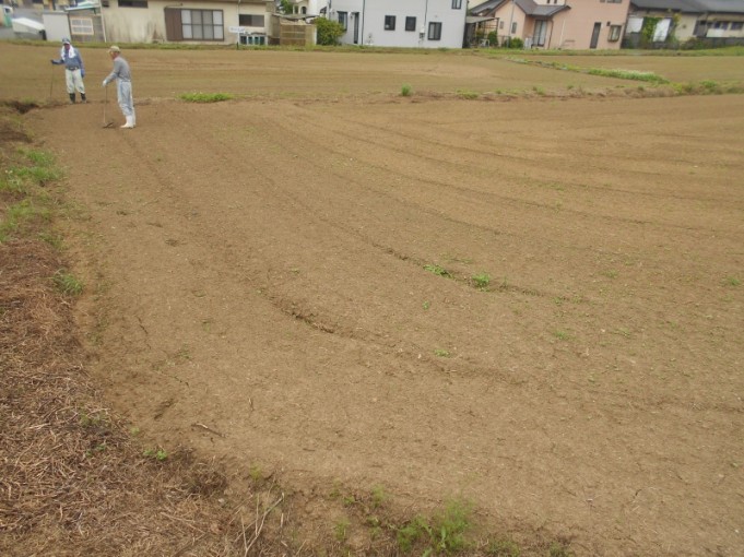 この畑は、もともと田んぼである休耕田を利用しています。そのため土が固まりやすく、何日かの日照りでマルチの下の土が固いので、バケツで水路の水を汲んでジョロで植える部分に水を入れてからさつまいもを植えました。