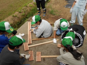 うね作り体験をしたことのある6年生は、班ごとに立てる木のプレートに文字を書きました。