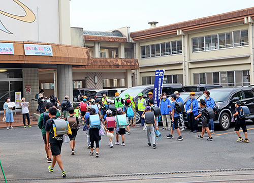 三和小学校では、三花地区の各団体の代表が集まり、玄関前で登校する子どもたちとあいさつを交わしました。
