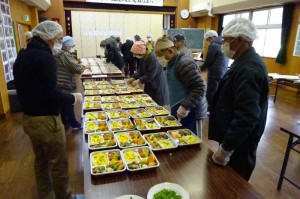 本年度最後の配食サービスが2月9日に行われ、三花公民館の「男の料理教室」と、女性の「料理教室」(自主教室)が調理や配達を担当しました。