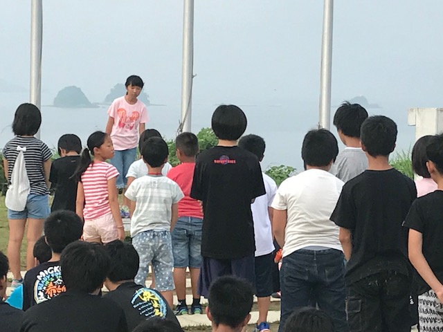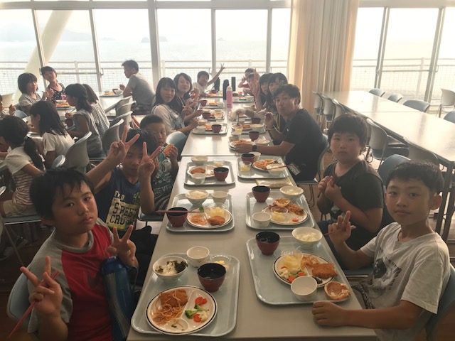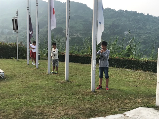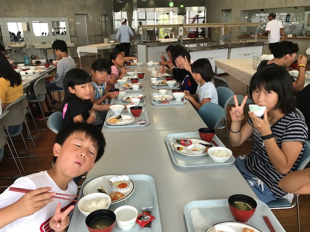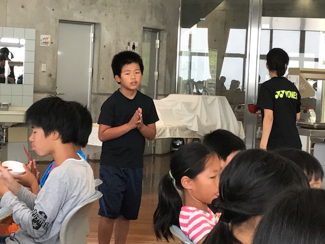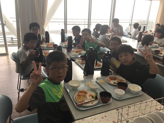 7時から朝のつどいが行われ、旗の掲揚、ラジオ体操、団体紹介を代表児童が堂々と行いました。朝食を食べています。iPhoneから送信