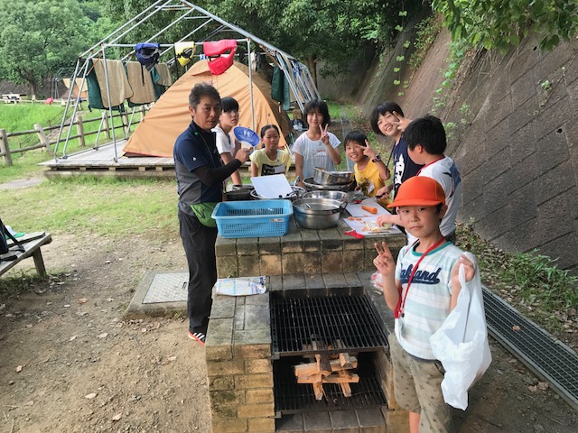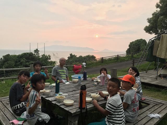 キレイな夕焼けを見ながら美味しいカレーを食べました。少しご飯を失敗した班もありましたが、全班美味しく食べてるようです。