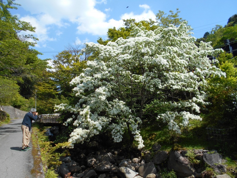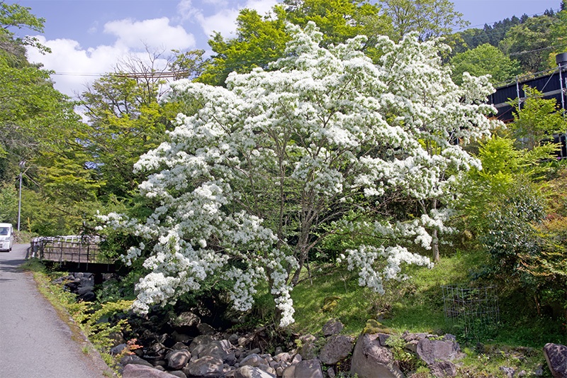 住民の方とお電話していたところ、小河内公民館の前にあるナンジャモンジャの木が今一番見頃とのことでした。