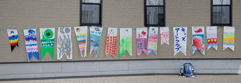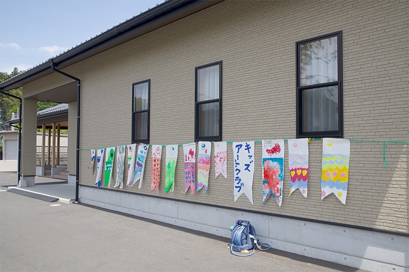 4月はこいのぼりを作りました。三花地区の人にも見てもらおうと、公民館玄関の横に展示しています。