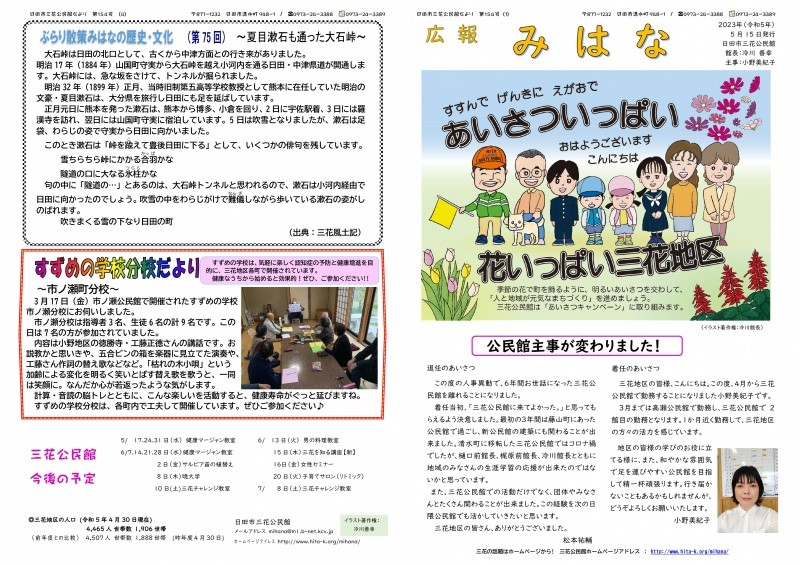 今回は表面に「あいさついっぱい、花いっぱい三花地区」の啓発イラスト!