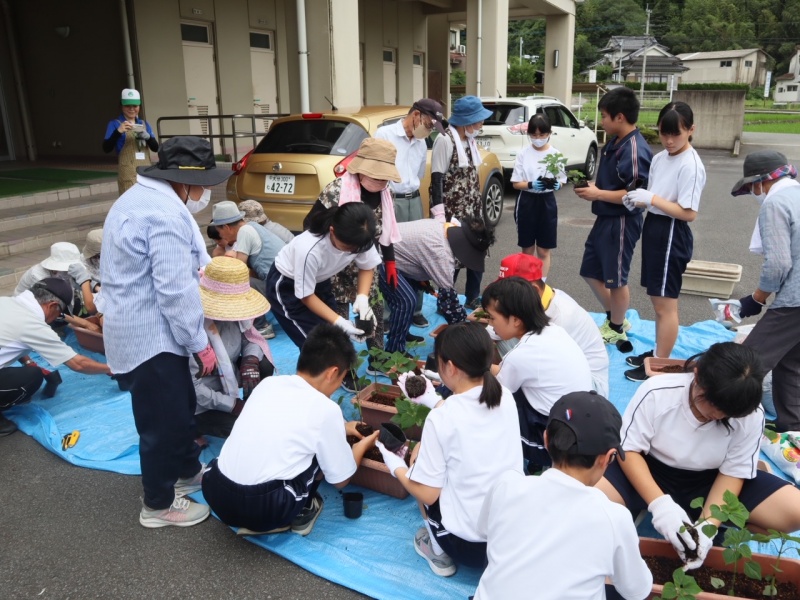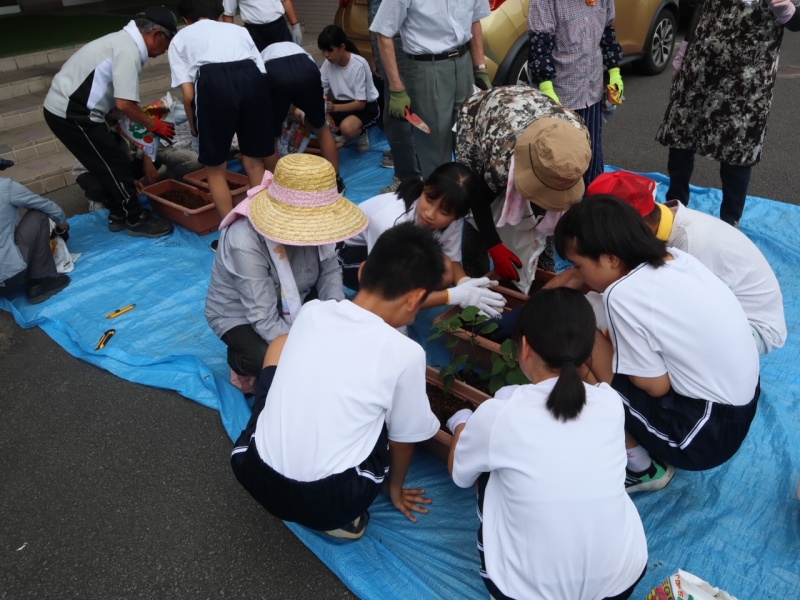 中学生と老人クラブの方々との世代間交流も進んだサルビア植栽でした。