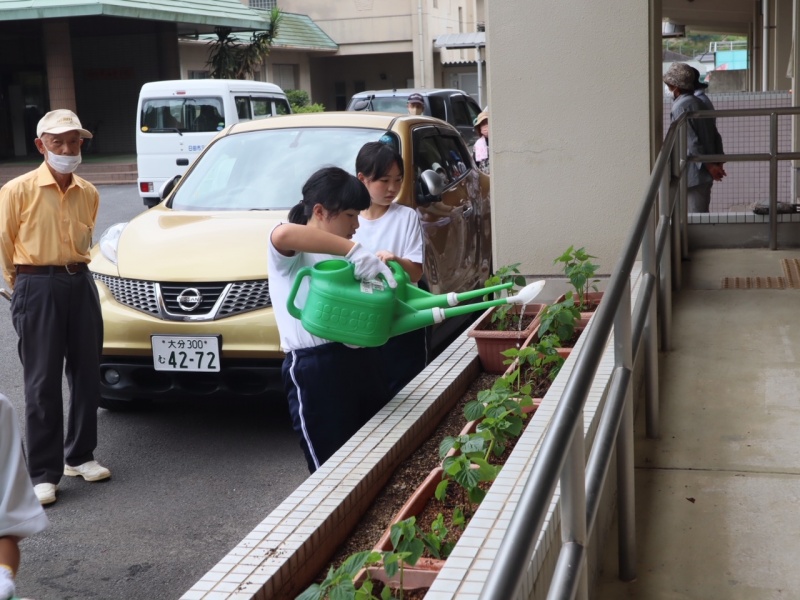 7月14日(金)花いっぱい運動の一環として、戸山中学校1年生と伏木町・市ノ瀬町・秋原町・藤山町の老人クラブの皆さんで、サルビアの植栽をしました。体育館の前に運び、水をたっぷりかけました。美しい花を咲かせることでしょう。