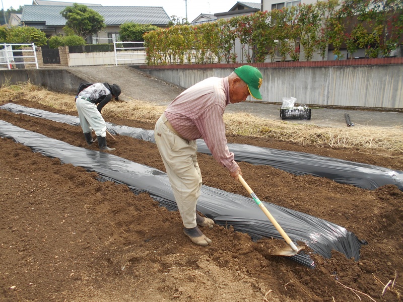 今年のチャレンジ教室の班は4班あるので4畝を立てる予定で、1畝は少年団に体験してもらうために、3畝を作りました。