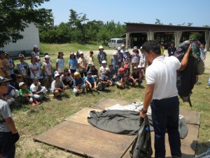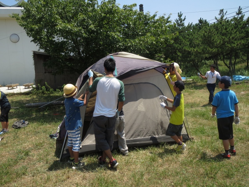 玄海の家の職員の方から説明を受けて、実際に自分たちで立てます。