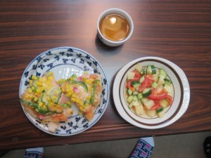 今回のメニューはごはんピザとコロコロ野菜のサラダと